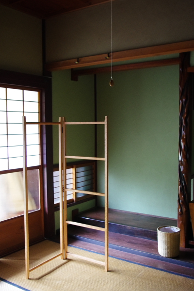 ウォールナットの衣桁は、お世話になっている高知のギャラリー「しばさき」さんに作りました。